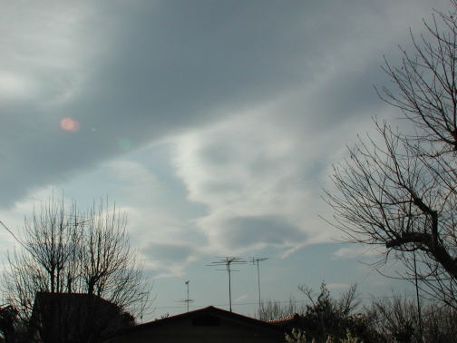 | 午後2時ごろ、雲行きが非常に怪しかった。今日は朝からよく晴れていたのだが、急にさざ波状の巻雲が出はじめた。みるみるうちに巻層雲が空を覆いはじめる。 |