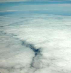 空を見上げると、西から東へ半透明の薄い雲のベールが4,5本伸びている。高さは1万メートルを超えていそうだ。巻雲の一種だ。形状からはひろがった飛行機雲にも見える。しかし、飛行機がくっついた本物の飛行機雲は、その雲よりもずっと低いところに細くてはっきりした白い線としてできている。巻雲の帯は、はるか東の地平線から西の地平線にかけて延々つづいている。幅だって視角で太陽の20〜30倍もあるから、高さ1万メートルにしても、3キロ以上になる。そんな雄大な飛行機雲もないだろう。